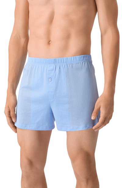 Голубые свободные боксеры сшили из тонкого хлопкового поплина. Шелковистый на ощупь материал приятно ощущается на коже и хорошо пропускает воздух, сохраняя комфорт в течение всего дня. Трусы застегиваются небольшой пуговицей на поясе со вшитой широкой резинкой.