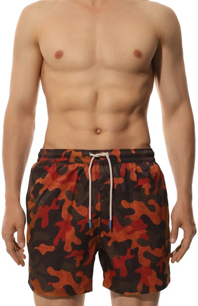 Эти плавки-шорты вдохновлены Капри 1960-х. Для пошива модели с тремя карманами и сетчатой подкладкой использовали легкий и при этом прочный переработанный полиэстер с принтом, в котором объединили два мотива: камуфл яжный и позаимствованный у банданы. Изделие из такого материала с персиковым финишем быстро сохнет и долго сохраняет яркость оттенков.