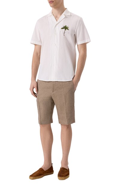 Бежевые шорты обеспечат комфорт в жаркую погоду. Для пошива модели длиной до колена использовали тонкий фактурный лен, который славится своей способностью пропускать воздух. Изделие с пятью карманами дополнили поясом-кулиской, в который продели плетеный шнур с кисточками на концах. Сзади — нашивка с логотипом бренда.