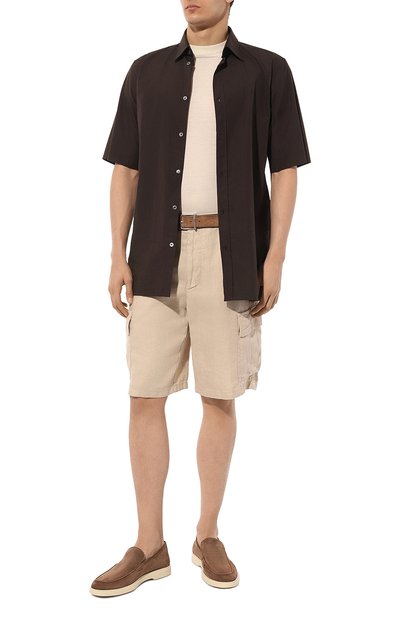 Бежевые шорты обеспе чат комфорт в жаркую погоду. Для пошива модели длиной до колена использовали тонкий фактурный лен, который славится своей способностью пропускать воздух. Изделие с пятью карманами дополнили поясом-кулиской, в который продели плетеный шнур с кисточками на концах. Сзади — нашивка с логотипом бренда.
