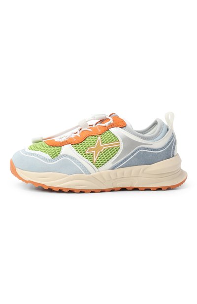 Накладки из замши и кожи в оттенках синего, зеленого и красного не только добавляют кроссовкам из белого нейлона красок, но и формируют жесткую конструкцию, которая защищает стопу от повреждений. Увеличенны й задник поддерживает щиколотку и пятку в правильном положении и не позволяет подвернуть ногу. Две застежки велкро помогают обуви адаптироваться к меняющейся высоте подъема. Внутри – мягкая кожа и дышащая сетка.