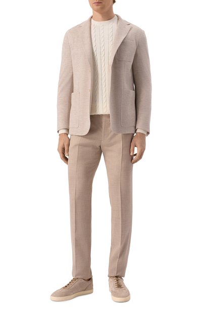 Светло-бежевый однобортный пиджак станет идеальным выбором для формальной встречи в теплую погоду. Модель без подклада сшили из мягкого легкого хлопка с добавлением прочного льна, поддерживающих оптимальный микроклимат. Широкие лацканы прошили вручную стежками пунто, поэтому они не потеряют четкость линий со временем.