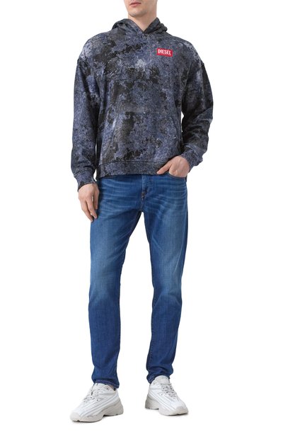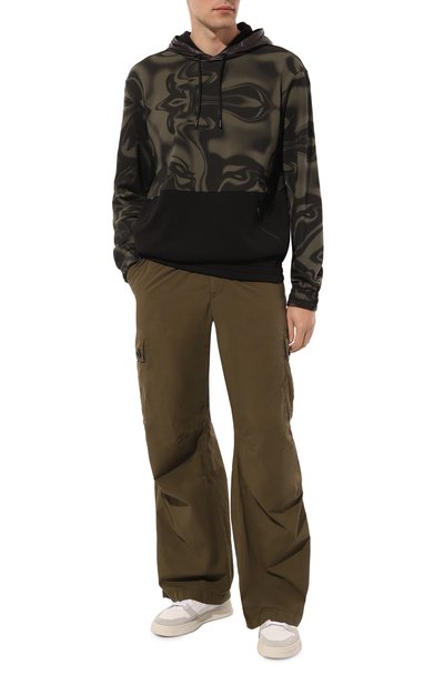 Графичный декор в виде логотипа, звезд, головы тигра и изображений медведей на этом разноцветном худи напоминает зарисовки из детского альбома, выполненные синей и черной шариковыми ручками. Для пошива свободной модели с чуть спущенной линией плеч использовали мягкий хлопковый трикотаж, который хорошо удерживает тепло, позволяя при этом коже дышать, и защищает от ветра.