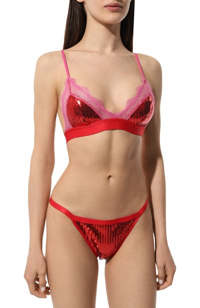 Для изготовления розовых слипов из коллекции Wild Rose использовали гладкий текстиль и ажурное полупрозрачное кружево. В состав эластичных материалов включили переработанный полиамид, снизив этим вред, наносимый окружающей среде. Модель с хлопковой ластовицей дополнили узким атласным поясом с миниатюрным бантом.