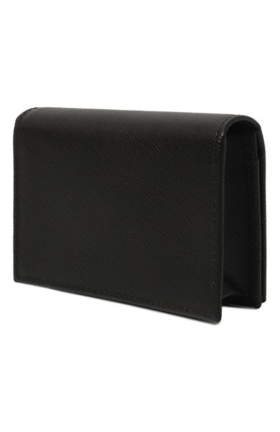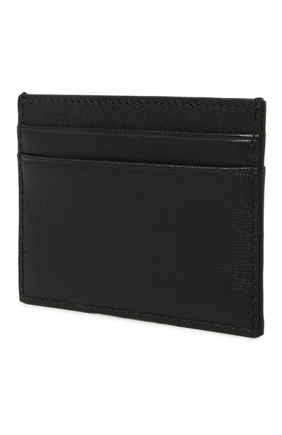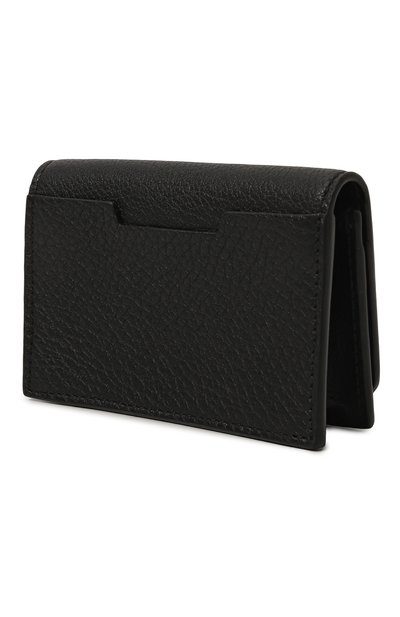 Для изготовления черного картхолдера с миниатюрным серебристым логотипом на передней панели использовали тисненую матовую кожу. Прочный материал устойчив к появлению царапин и потертостей, поэтому аксессуар будет долго выглядеть безупреч но. Модель с четырьмя слотами для банковских карт, расположенных попарно, дополнили центральным открытым карманом для чеков.