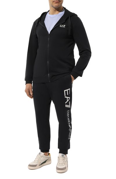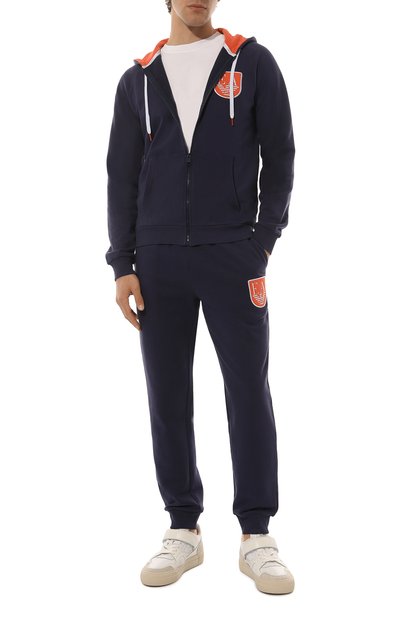 Для изготовления темно-синих джоггеров использовали плотный хлопковый трикотаж, который сохраняет тепло, но дает коже дышать. По бокам предусмотрели два втачных кармана, а на широком поясе — кулиску со шнуром. На левой брючине расположили крупный логотип, дополненный вышитой фирменной эмблемой.