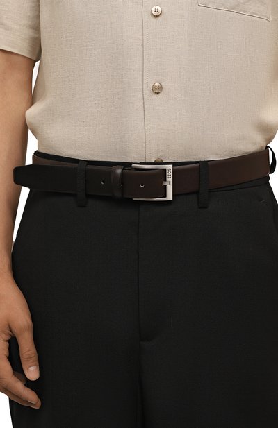 Ремень средней ширины выполнили из итальянской телячьей кожи благородного коричневого оттенка. Гладкий материал тщательно отшлифовали, поэтому лаконичный аксессуар обрел едва заметный блеск. На прямоугольной металлической пряжке выгравировали миниатюрный логотип бренда.