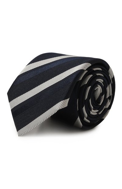 Темно-синий галстук из зернистого микса шелка и полиэстера пересекает контрастная полковая полоска с гладкой и ребристой фактурой. Плотную немнущуюся ткань раскроили так, чтобы рисунок был симметричен заостренному концу и сохранял геоме трию по всей длине аксессуара.