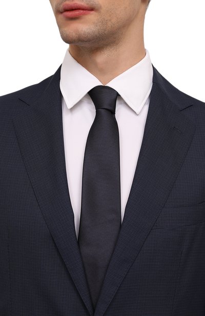 Базовый темно-синий цвет и однотонный дизайн позволяют этому галстуку классической ширины рифмоваться с костюмами разной палитры. Изделие выполнили из плотного материала на основе шелка, легкий блеск которого подчеркивает фактурный микроузор.