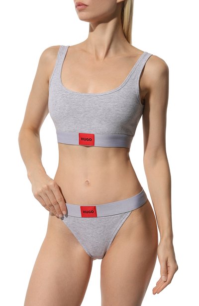 Меланжево-серые стринги сшили из мягкого стрейчевого джерси на основе органического хлопка, при выращивании и производстве которого не использовали токсичные химикаты. Модель хорошо пропускает воздух и комфортно облегает бедра. Плоский широкий пояс декорировали фирменной красной нашивкой.