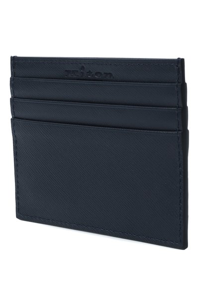 Темно-синий лаконичный картхолдер с двумя слотами по бокам и центральным отделением для чеков сшит из фактурной прочной кожи с глянцевым блеском. Со временем на ней не появляются потертости и заломы, а изделия из такого материала надолго сохраняют заданную форму. Небольшой аксессуар украшен серебристым тисненым логотипом бренда.