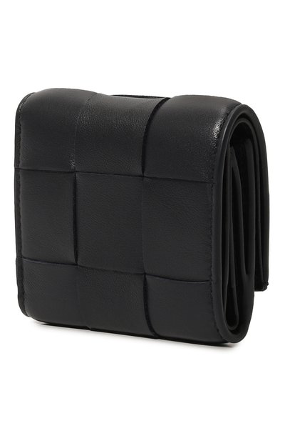 Темно-синее портмоне изготовили из особенно мягкой кожи ягненка, которую нарезали на полосы и переплели в фирменной технике intreccio. Модель дополнили съемным карманом для монет, украшенным тиснением в виде логотипа. Внутри аксессуара разместили три слота для банковских карт и отделение для купюр и чеков.