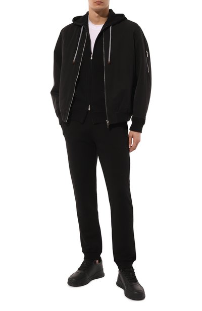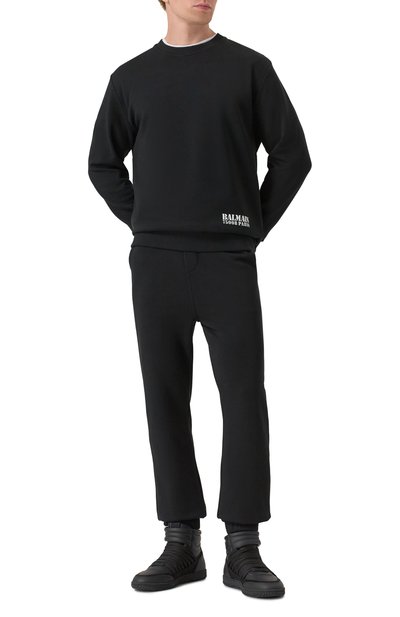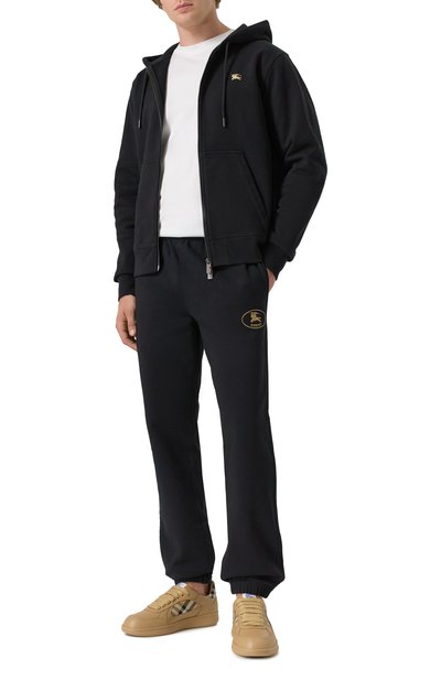 Черные джоггеры с тремя карманами выполнили из мягкого хлопкового трикотажа с приятной на ощупь изнанкой. Модель сохраняет тепло, но при этом не препятствует циркуляции воздуха. Изделие с широким эластичным поясом и манжетами комфортно садится по фигуре и не ограничивает свободу движений.
