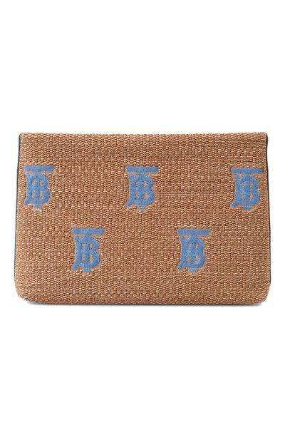 Клатч из текстиля, имитирующего соломку, усилен по краям гладкой голубой кожей. На обеих сторонах аксессуара вышили фирменную монограмму. Во внутренний слот поместится кредитная карта, а в основное отделение с подкладкой из хлопка и льна – планшет.