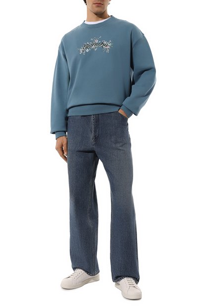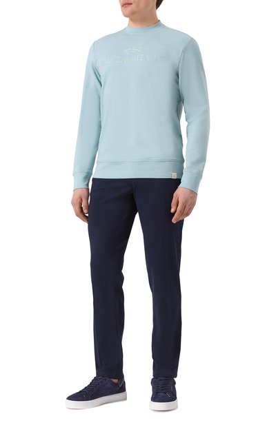 Голубой свитшот органично дополнит образ с брюками и кедами. Для создания модели с рукавами реглан и выведенными наружу плоскими швами использовали мягкую пряжу из тщательно очищенного хлопка, хорошо пропускающего воздух, усиленную акрилом. Принадлежность марке обозначили миниатюрной контрастной нашивкой с логотипом.