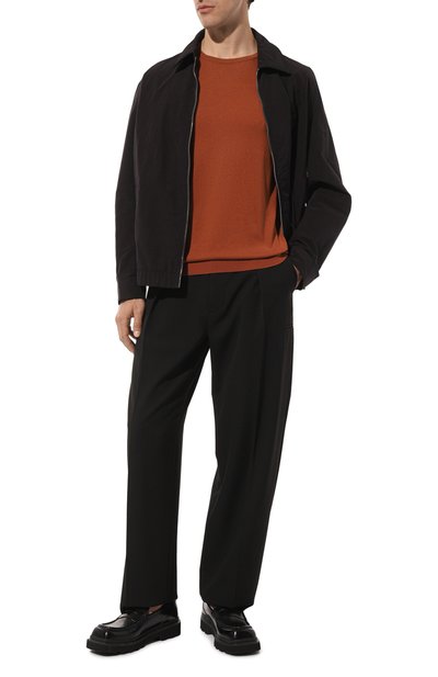 Для создания лаконичной футболки использовали гладкое джерси, связанное из лиоцелла и хлопка. Единственным декором модели сделали узкий бархатный кант, подчеркивающий плечевые швы.