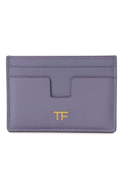 Для изготовления футляра для кредитных карт использовали мягкую зернистую кожу, окрашенную в фиолетовый цвет. Краям четырех слотов придали разную форму, создав графичный узор на передней и задней панелях. Аксессуар с центральным карманом для чеков декорировали золотистой накладкой в виде монограммы TF.
