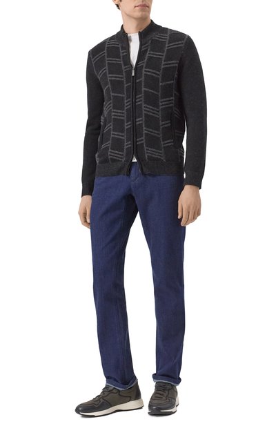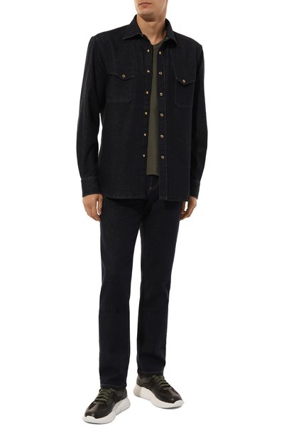 Комбинированный верх кроссовок James сдержанного оттенка хаки выполнили из прочного текстиля с камуфляжным принтом, пластичной телячьей кожи и бархатистой замши. Пару установили на массивную амортизирующую подошву из легкой резины и дополнили задник объемной фигурной вставкой. О принадлежности марке, основанной Томом Фордом, говорят логотипы сзади, на язычке и сбоку.