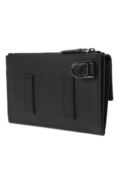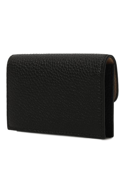 Для изготовления черного портмоне использовали мягкую крупнозернистую кожу. Аксессуар с тремя слотами для банковских карт дополнили вместительным отделением на молнии, в котором поместятся монеты, чеки и купюры. На принадлежность марке указывает золотистый тисненый логотип марки спереди.