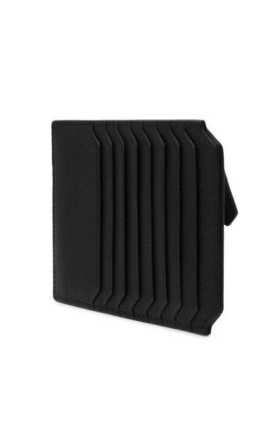 Для изготовления черного прямоугольного портмоне с миниатюрной брендированной накладкой использовали прочную кожу с мелким зернением. Чтобы подчеркнуть тисненую фактуру, материал отшлифовали до глянцевого блеска. Аксессуар с четырьмя слотами и вместительным карманом застегивается на круговую молнию.