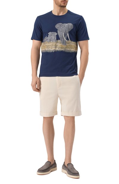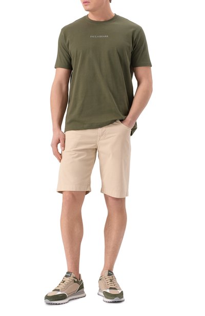 Для пошива кремовых шортов силуэта Regular fit использовали мягкий хлопковый твил. Материал с диагональным плетением хорошо держит заданную кроем форму и сохраняет комфортный микроклимат в теплую погоду. Края четырех карманов подчеркнули черным вышитым кантом. В такой же технике выполнили изображение ложки и вилки сзади и крупную эмблему спереди.