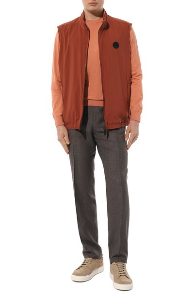 Белый жилет из тонкого непродуваемого полиэстера с добавлением полиуретана прекрасно дополнит повседневный комплект. Эластичные пояс и воротник обеспечивают дополнительный комфорт и придают изделию с трикотажным подкладом сходство со спортивной толстовкой. При создании модели итальянские дизайн еры вдохновлялись большим теннисом, о чем говорит фирменный патч с теннисной ракеткой и символикой марки, основанной Брунелло Кучинелли.