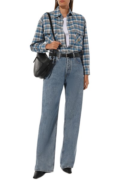 Синие джинсы с выбеленным эффектом органично впишутся в образ разной степени сложности. За комфорт в течение дня отвечают выверенный крой и мягкий плотный хлопок, который не потеряет опрятный вид со временем. Брюки украсили сзади знаковыми для бренда крестами, вышитыми светлыми нитями.