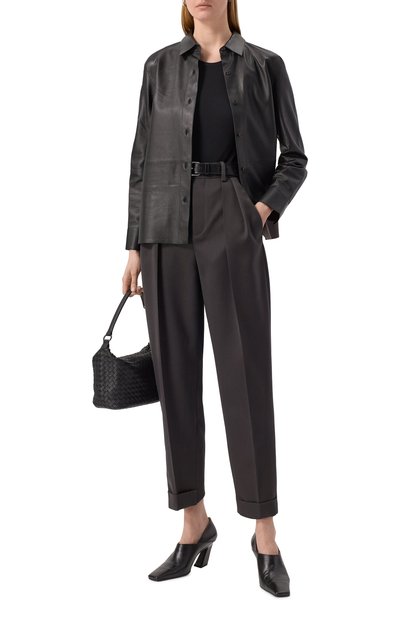 Черная рубашка с отложным воротником могла выглядеть строго, если бы не кружевные узкие вставки по краю длинных рукавов и низа. Для создания модели с вышитой эмблемой на нагрудном кармане выбрали ультратонкий гладкий лен, обработанный до исключительной мягкости и шелковистого блеска.