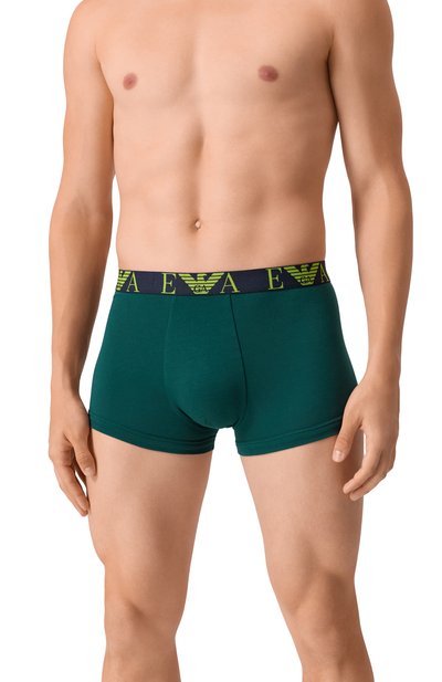 Боксеры сшили из хлопкового джерси стрейч. Облегающую модель дополнили плоским эластичным поясом, украшенным логотипами. В комплекте – три аналогичные модели.
