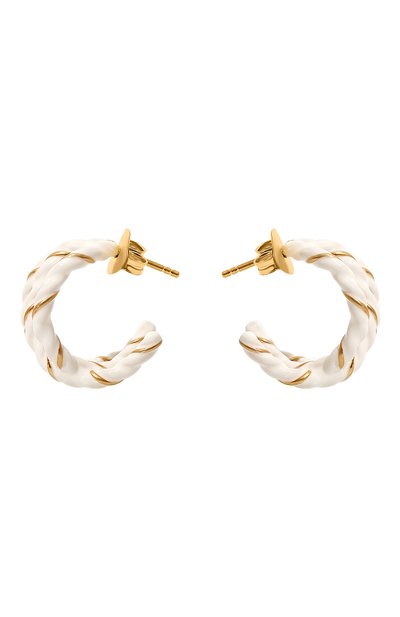 Серьги, напоминающие витой тонкий шнур, изготовили из легкого ювелирного сплава с гальваническим покрытием золотом. Динамичность скульптурной формы модели с белой лаковой поверхностью подчеркнули с помощью узкой контрастной полосы. Принадлежность марке обозначили логотипом на внутре нней стороне пусетов.