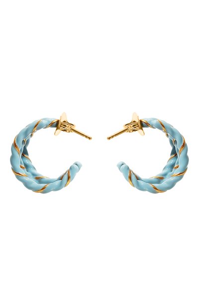 Небольшие позолоченные серьги с застежками-пусетами, выполненные в виде витых шнуров из гипоаллергенного ювелирного сплава, покрыты глянцевой голубой эмалью. Изделия создаются вручную, поэтому не существует абсолютно одинаковых украшений – каждое по-своему неповторимо.