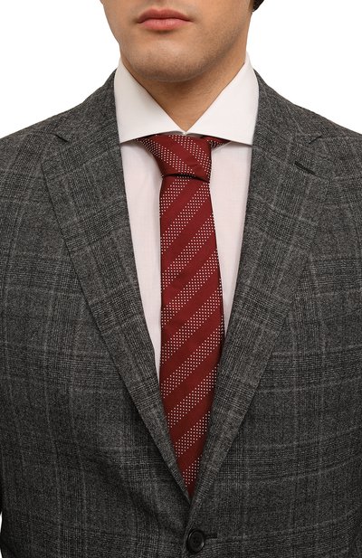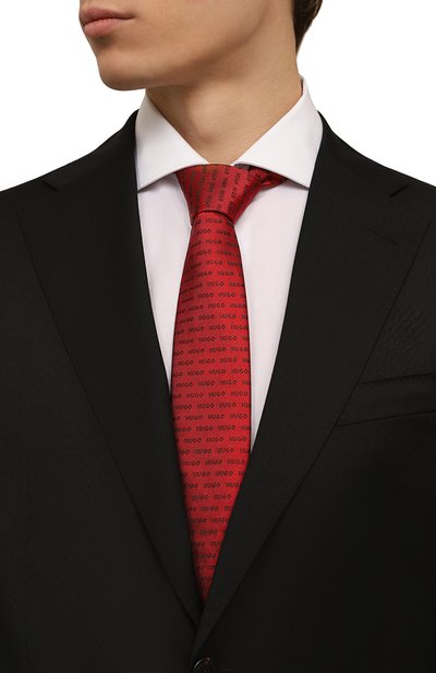 Узкий алый галстук станет цветовым акцентом в строгом образе с сорочкой и костюмом. Для изготовления модели использовали мягкий шелковый жаккард с геометрическим узором, придающим ей визуальный объем. После развязывания узла на аксессуаре из такой ткани не остаются заломы, поэтому он будет долго выглядеть безупречно.