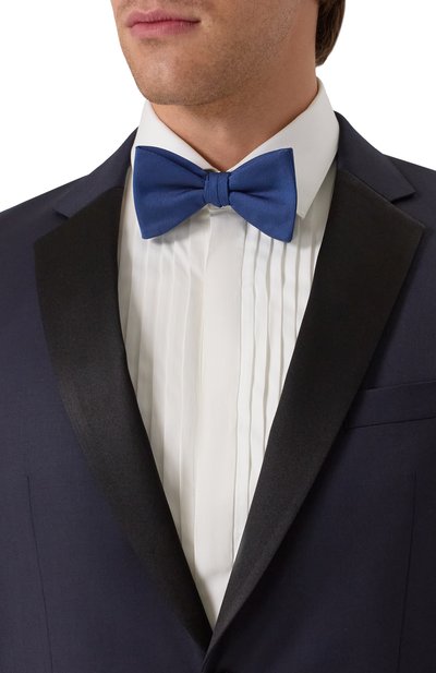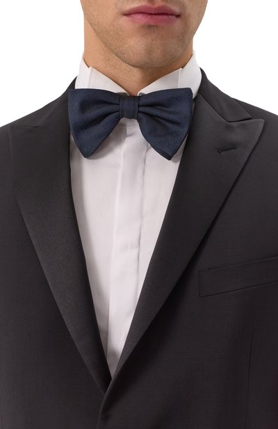 Для создания галстука-бабочки Pre-Tied использовали фактурный шелковый жаккард. Аксессуар с застежкой-крючком на узкой ленте гармонично завершит и комплект для дресс-кода Black tie и торжественный образ с сорочкой и смокингом.