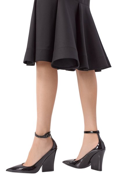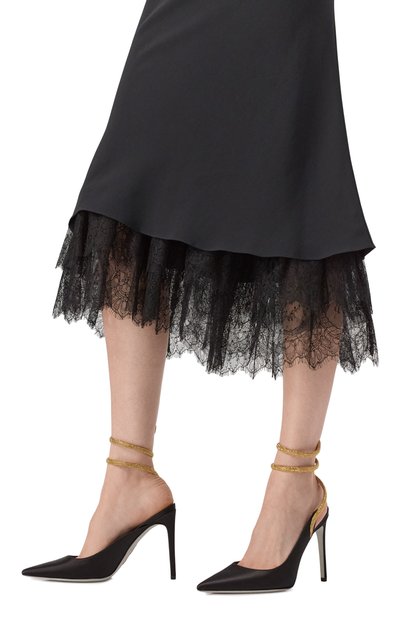 Черные туфли в исполнении Эдуардо Каовилла – идеальное дополнение вечернего образа. Нарядной модель на высокой шпильке, с открытым задником делают деликатный блеск гладкого атласа и мерцание серебристых стразов. Ими почти полностью покрыли напоминающий змею узкий ремешок, несколько раз обвивающий щиколотку.