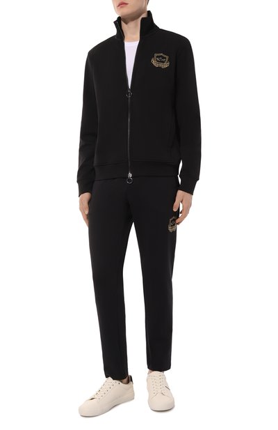 Для пошива зауженных черных брюк использовали тонкий смесовый трикотаж, в котором хлопок отвечает за мягкость и оптимальный микроклимат, а нейлон — за шелковистую гладкость и прочность. Широкий пояс-кулиска регулирует посадку на талии. Сзади расположен карман с кнопкой, по бокам — еще два прорезных. Под левым — миниатюрный патч, говорящий о принадлежности марке.