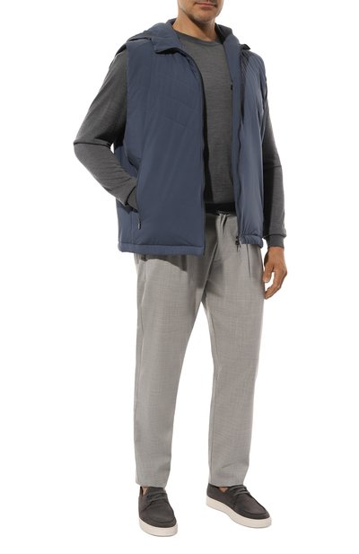 Синий пуховый жилет станет хорошим спутником в переменчивую погоду. Изделие сшили из запатентованной мембранной ткани Typhoon 20000. Материал на основе полиэстера с добавлением спандекса отталкивает влагу, защищает от ветра, а также пропускает воздух и выводит наружу излишки тепла, создавая терморегулирующий эффект. Модель с двумя карманами и воротником-стойкой дополнили съемным капюшоном.