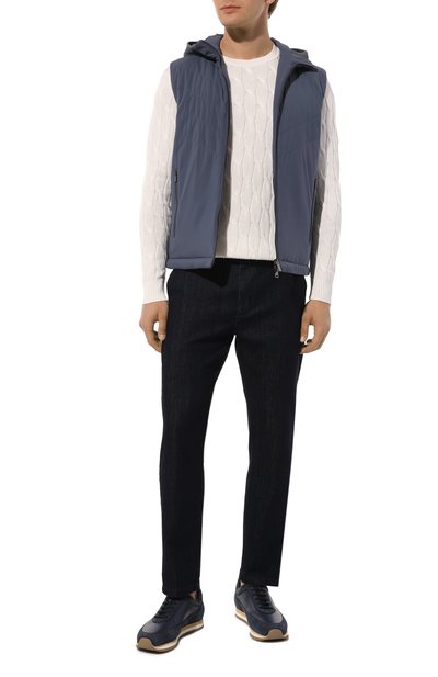 Темно-синий жилет с тонким утеплителем не создает дополнительный объем, поэтому может сыграть роль как верхней одежды, так и подстежки для пальто. Защиту от дождя и ветра обеспечивают прочный полиэстер с туго переплетенными нитями и капюшон с ребристым трикотажным кантом. Помимо боковых карманов у модели с подкладом из хлопкового джерси предусмотрели два внутренних: накладной и врезной для телефона, блокирующий электромагнитное излучение.