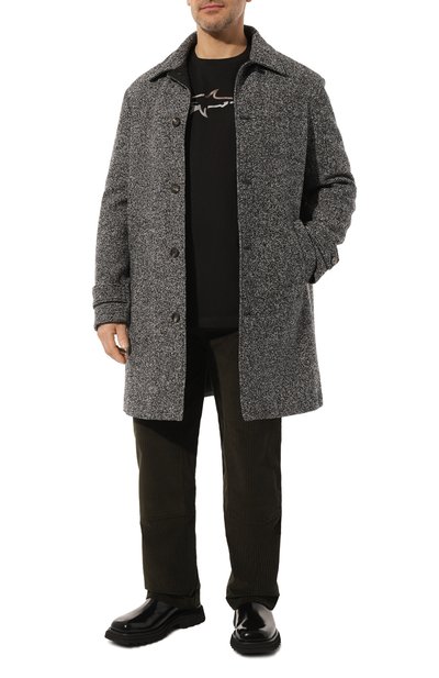 Черную футболку с круглой горловиной выполнили из приятного на ощупь хлопкового джерси. Оно хорошо пропускает воздух, обеспечивая оптимальный микроклимат. Спереди изделие украсили крупным принтом в виде фирменной акулы. При этом контур эмблемы подчеркнули ее же повторяющимся изображением.