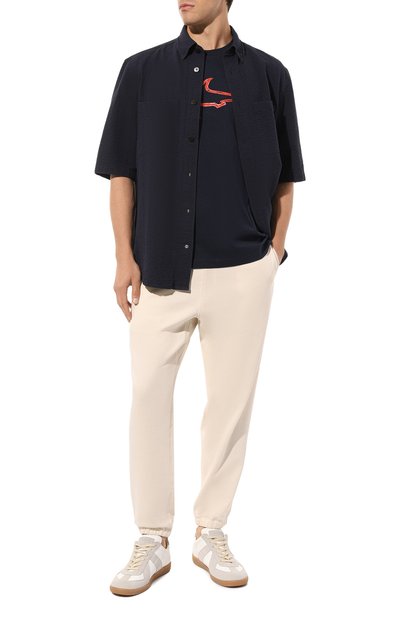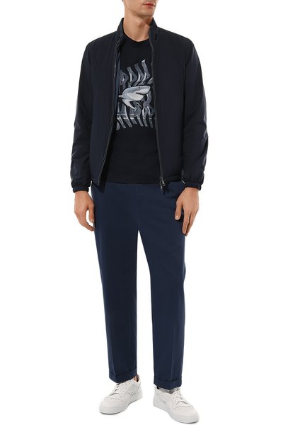 Темно-синюю футболку легко сочетать и с яркими вещами, и с повседневной одеждой в спокойной палитре. Модель из экологичного хлопкового джерси украси ли спереди крупным блестящим принтом в виде силуэта символичной акулы.