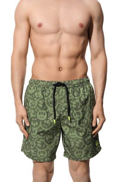 Зеленые плавки-шорты с широким эластичным поясом-кулиской, украшенным фирменным патчем сзади, сшили из тонкого шелковистого текстиля с принтом, позаимствованным у банданы. Прочный материал хорошо держит форму и не теряет насыщенность цвета под яркими лучами солнца. Для удобства у вещи предусмотрели три кармана.