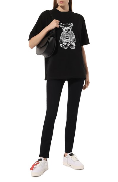 Свободные в бедрах темно-синие джинсы сшили из прочного денима с добавлением небольшого процента стрейчевых волокон. Модель немного выбелили и декорировали искусственными заломами, чтобы придать ей состаренный вид. Пояс сзади украсили черным кожаным патчем с тисненым логотипом.