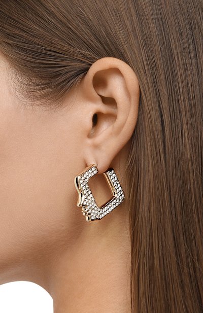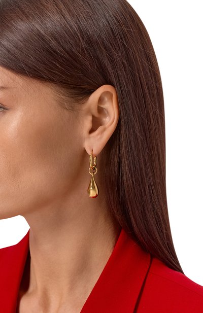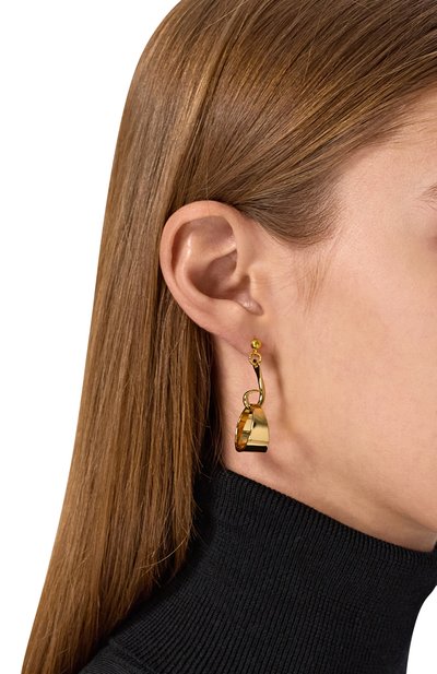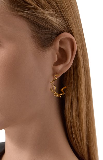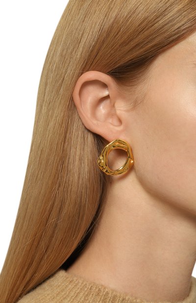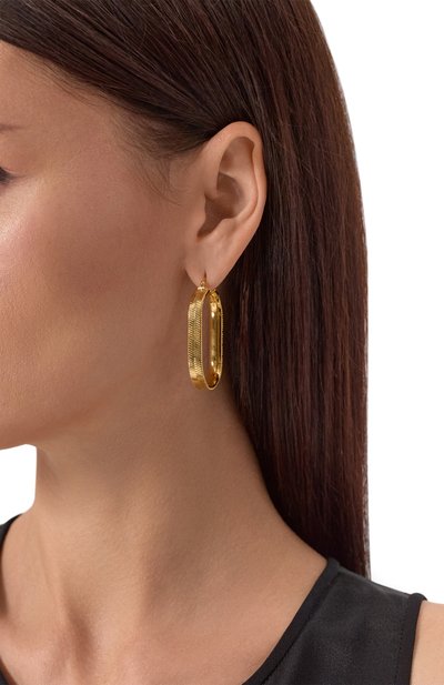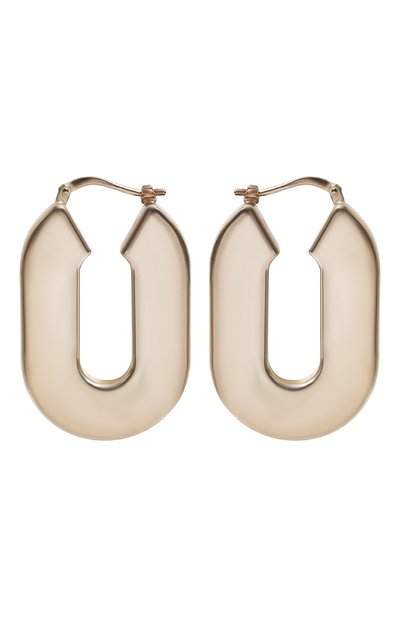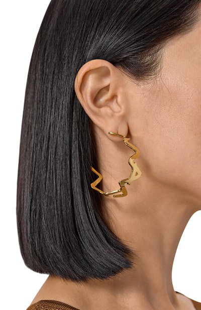 Команда марки по-своему интерпретировала серьги-обручи, придав им скульптурную форму. Аксессуар с замком-булавкой изготовили из отполированной латуни с антиоксидантной обработкой и гальваническим покрытием серебром. Украшение органично будет смотреться и с менее формальным, и с более строгим образом.