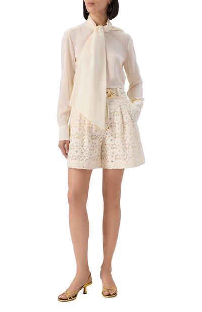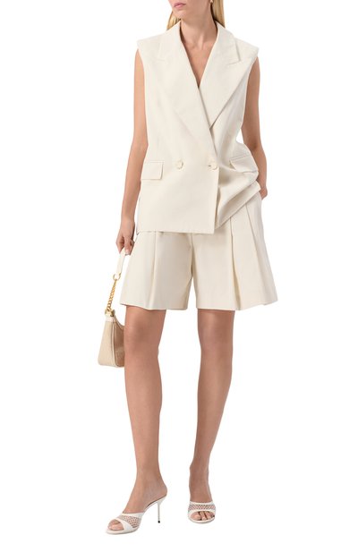 Для пошива кремовых расклешенных шорт из коллекции Natura Ники Циммерманн выбрала мягкий фактурный жаккард с полосатым узором и неброским шевронным плетением. В состав материала включили прочный лен и шелковистую вискозу, сделавшие модель с отворотами и широким регулируемым поясом легкой и сохраняющей ощущение свежести весь день.
