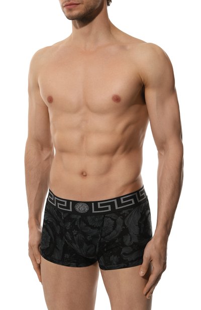 Серые боксеры с мотивом в виде цепей поверх брендированного паттерна сшили из хлопкового джерси. Широкий пояс трусов, выполненный из стрейчевой ленты, украсили патчем с архивным логотипом из 1990-х.