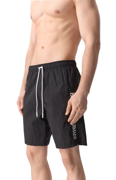 Черные плавки-шорты с эластичным поясом-кулиской, выполнили из быстросохнущего нейлона с гладкой шелковистой поверхностью. Сзади – люверсы, благодаря которым модель не будет надуваться в воде. На принадлежность марке указывают фирменная брендированная лента сбоку и нашивка на заднем накладном кармане, в который можно спрятать изделие в сложенном виде.