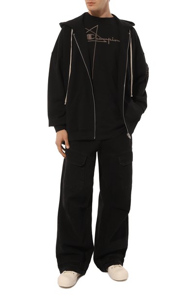 Свободную футболку цвета кофе с молоком Рик Оуэнс создал вместе с командой Champion. Модель с фирменным вертикальным швом на спинке украсили спереди крупной вышитой эмблемой капсульной коллекции, в которой логотип американского бренда дополнили пентаграммой. Для пошива изделия со спущенной линией плеч использовали тонкое дышащее джерси из сертифицированного GOTS органического хлопка.
