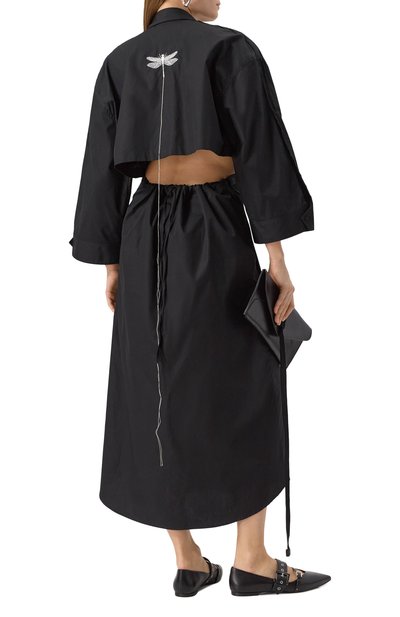 Создавая черное платье Hourglass, в бренде вдохновились силуэтом одноименного жакета. Линию плеч слегка приспустили, рукава с манжетами удлинили, а низ сделали фигурным, как у рубашки. Модель из плотной хлопковой ткани наши стилисты предлагают подружить с контрастными босоножками на шпильке и небольшой сумкой.