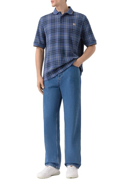 Для изготовления прямого поло выбрали тонкий хлопок, который отлично пропускает воздух, не мнется и не пилингуется. На этом тонком материале напечатали геометрический мотив с вписанным в него логотипом. Воротник сделали белоснежным и дополнительно деликатно акцентировали его узкой синей полосой вдоль края.