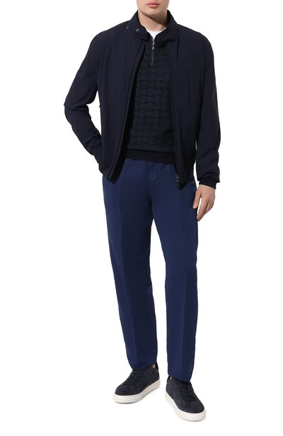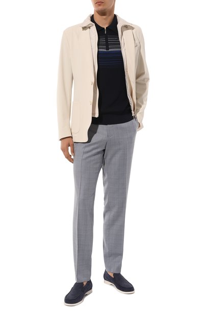 Темно-синее поло с ритмичным узором на несколько оттенков светлее спереди получилось максимально комфортным. Модель сшили из мягкого трикотажа, в котором соединили нежный шелк и мягкий дышащий хлопок. Материал приятно ощущается на коже и поддерживает оптимальный микроклимат. Глубина горловины регулируется короткой молнией.