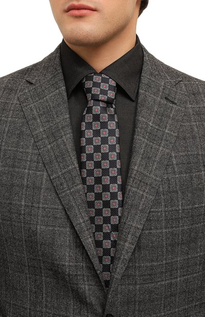 Темно-синий галстук с графичным узором сшили вручную из прочного мягкого шелка. Гладкие нити придали аксессуару легкий блеск, а мотиву — визуальный объем. Модель не деформируется со временем и держит строгую вертикаль, а после развязывания узла расправляется, не оставляя заломов.